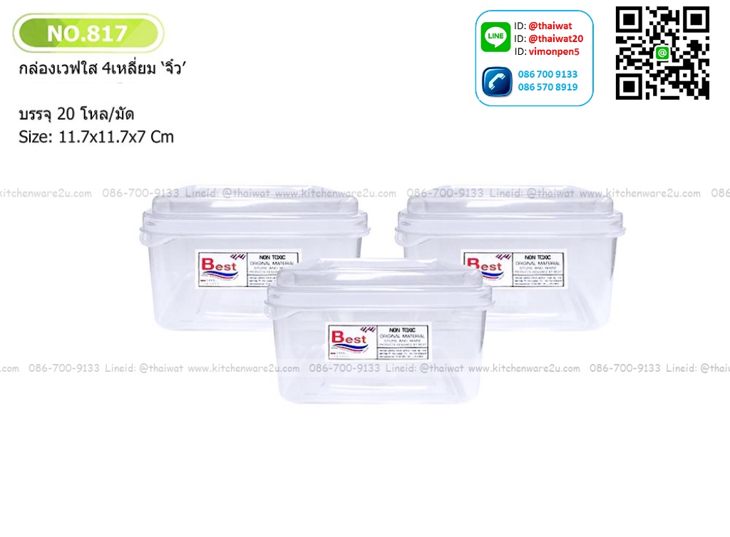 P07307 กล่องเวฟเหลี่ยม 0.5 ลิตร (11.7*11.7*7 cm) No.817 BG ราคาส่งต่อ 20 โหล: 240 ใบ:เฉลี่ย 115 บต่อโหล